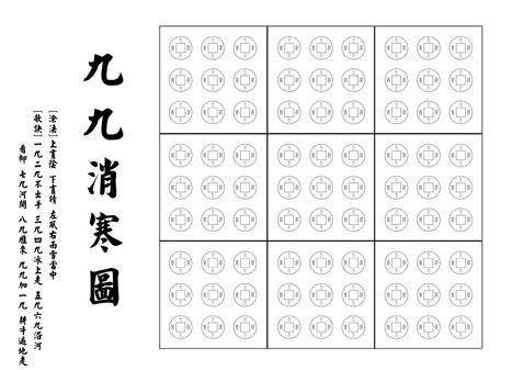 除“九九消寒歌”外,还有“九九消寒图”,来形象地反映暖长寒消。“九九消寒图”有九九八十一个单位,以用来作为记录时间的日历。最常见的“九九消寒图”有三种图式:文字、梅花、圆圈。