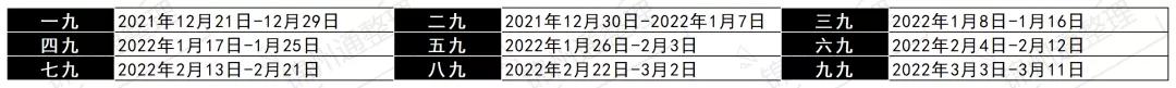 如果按冬至节气确定为数九开始之日,那今年数九寒天的具体时间表概括如下: