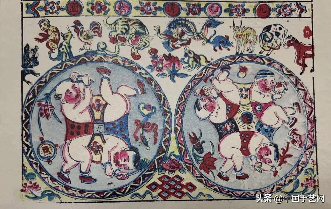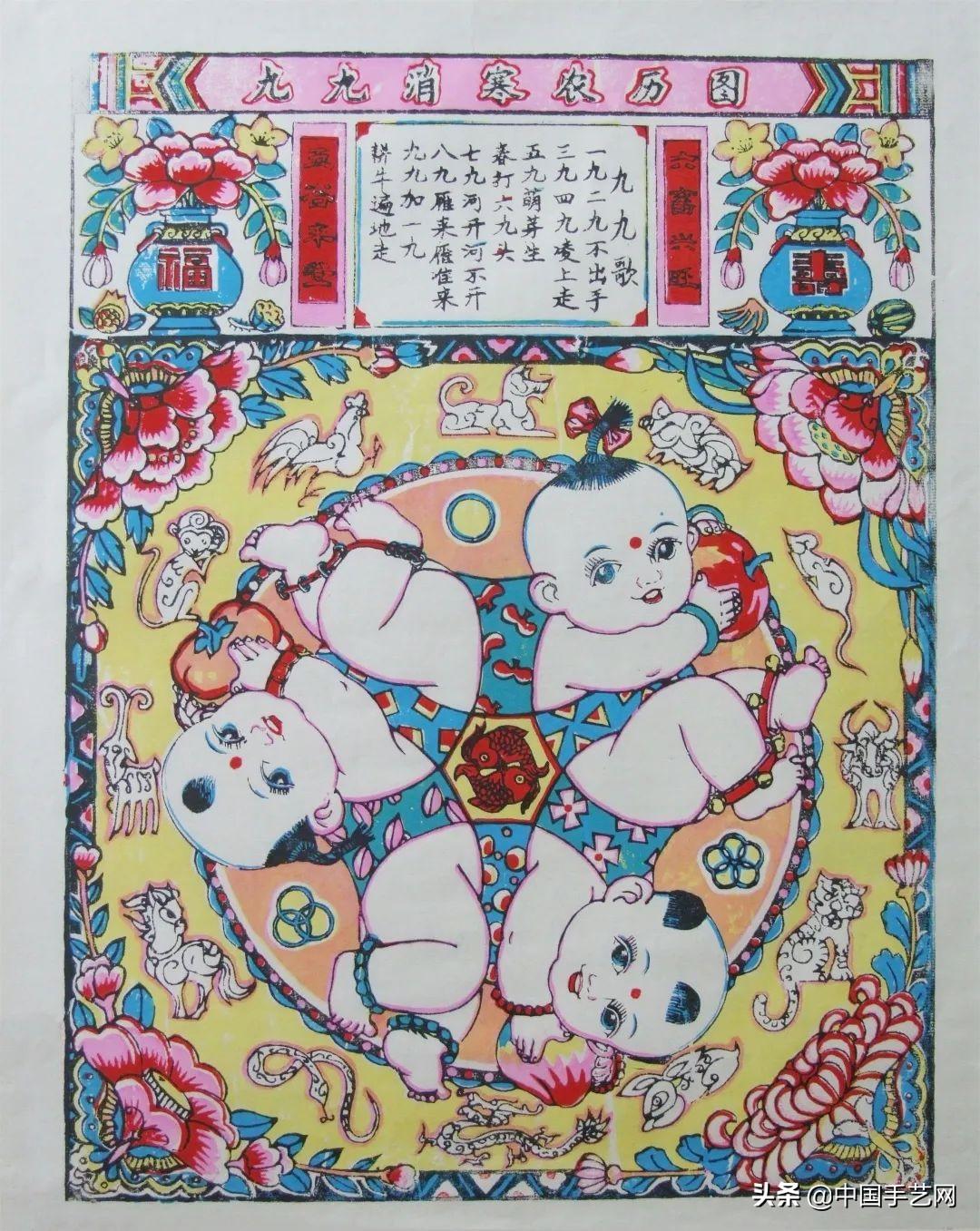 《连生贵子九九消寒图》是年画作品中常见的题材,民国时期的一版,巧妙地画了两组娃娃,一组二童变四童,一组三童变六顺,臀部互用,联作俯仰之姿,俗名“娃娃争腚”。“腚”与金锭谐音,又有人财两旺之意。一方面表现了连生贵子,力争上游的主题;另一方面,五童变十童,也有五子十成,祈盼丰收的美好寓意。
