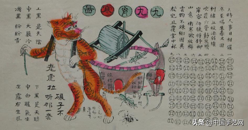 清代早期以八十一枚古钱形式分九行构成的《消寒图》中,印有指导填涂的韵文:“上黑是天阴,下黑是天晴。中黑天严冷,中白暖气生。满黑纷纷雪,左雾右生风。”铜钱图案将一个圆圈划分为五个区域,农民根据每日的天气,在相应位置涂墨,如此八十一天,便得到了整个冬天的天气记录。来年就可以此总结并指导生产,如果雪天多,就是瑞雪兆丰年,晴天多,来年就要注意虫害。中间图画却与消寒无关,是民间的一个歇后语俏皮话,“老虎拉碾子——不听那一套”,聊以助兴。