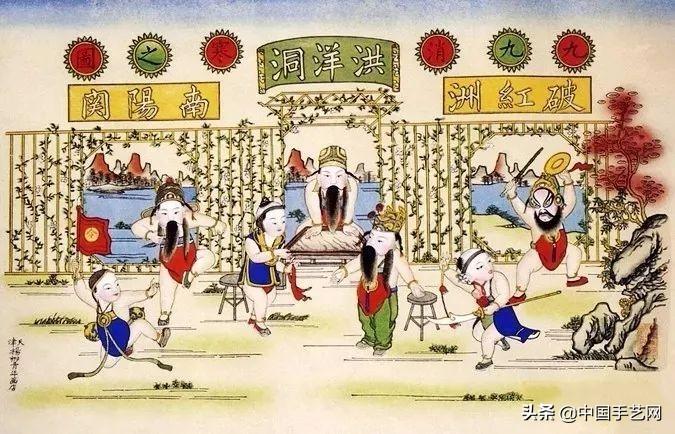 天津杨柳青年画《九九消寒之图》中,画了七个小孩,扮演三种戏曲故事:中间洪洋洞,即杨家将杨延昭梦父盗骨;左边南阳关,为隋末伍云召反隋弃关;在右边破洪洲,是穆桂英破天门阵。三个戏出的小故事,每出戏名三个字,每字笔画为九,共八十—笔。