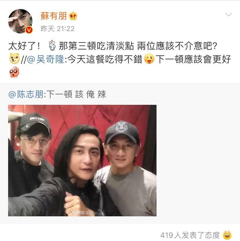 随后吴奇隆转发陈志朋的该条动态并回应称:“今天这餐吃的不错,下一顿应该会更好!”,苏有朋也转发配文称:“太好了!那第三顿吃清淡点,两位应该不介意吧?”
