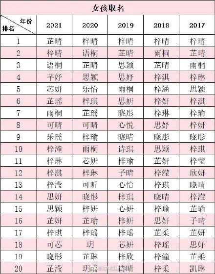 排名第2至10的女孩名字为梓晴、语桐、芊妤、芯妍、芷瑶、雨桐、可晴、乐瑶、梓潼。