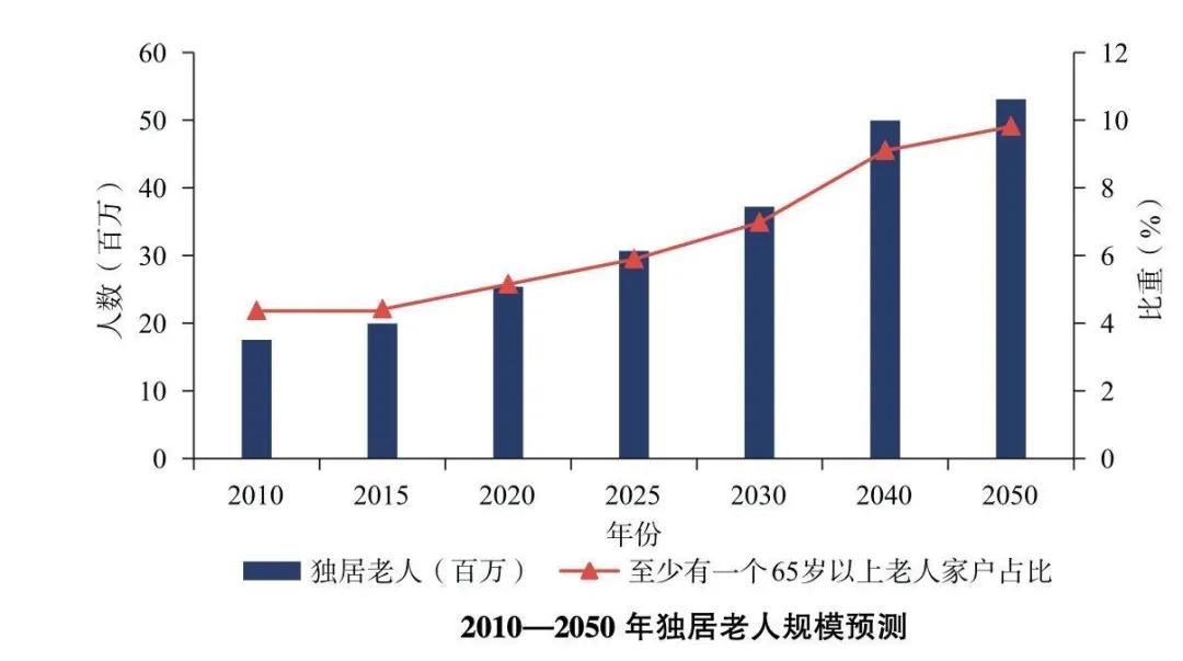 据全国人口普查资料显示,近十年来,我国65岁及以上老人独居规模正在逐步扩张,并且根据2021年全国第七次人口普查数据显示,我国已经正式进入老龄化社会,未来,老龄化趋势还将加剧。