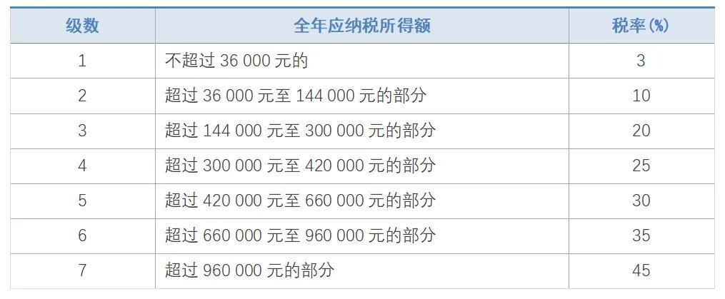 每个人应纳的税都是由个人的收入决定的,关于如何缴纳个人所得税,国家有一套严格的法律规定,最新的个人所得税法将个税免征额由3500元提高到5000元,也就是说你的工资如果达到了5000元,就需要向国家纳税了,那么具体要怎么纳呢?来看看下面聚鑫会计整理的个人所得税税率表吧。一、 综合所得适用税率表1. 个税法规定,居民个人的综合所得,以每一纳税年度的收入额减除费用六万元以及专项扣除、专项附加扣除和依法确定的其他扣除后的余额,为应纳税所得额。2. 居民每一个纳税年度内取得的综合所得包括:工资薪金、劳务报酬、稿酬、特许权使用费所得。