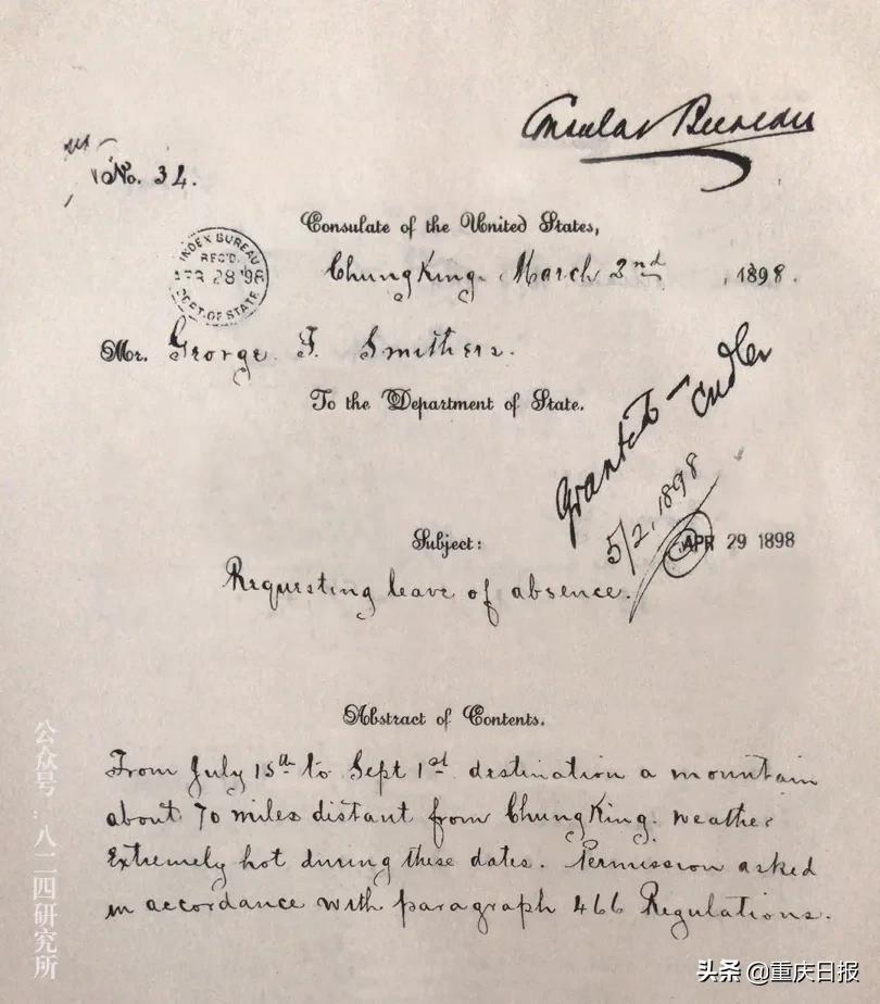 (1898年,美国驻重庆领事石密特给美国助理国务卿写信,申请批准其夏季移居到70英里外的一座山上避暑)