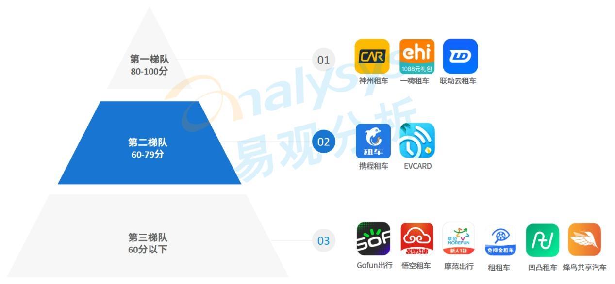 在这个千亿级的大市场中,中小型参与者不断出局,具有核心竞争力的玩家持续深化探索,目前已经形成较为稳定的市场格局。易观数据显示,神州租车、一嗨租车与联动云租车占领第一梯队,形成三足鼎立之势。