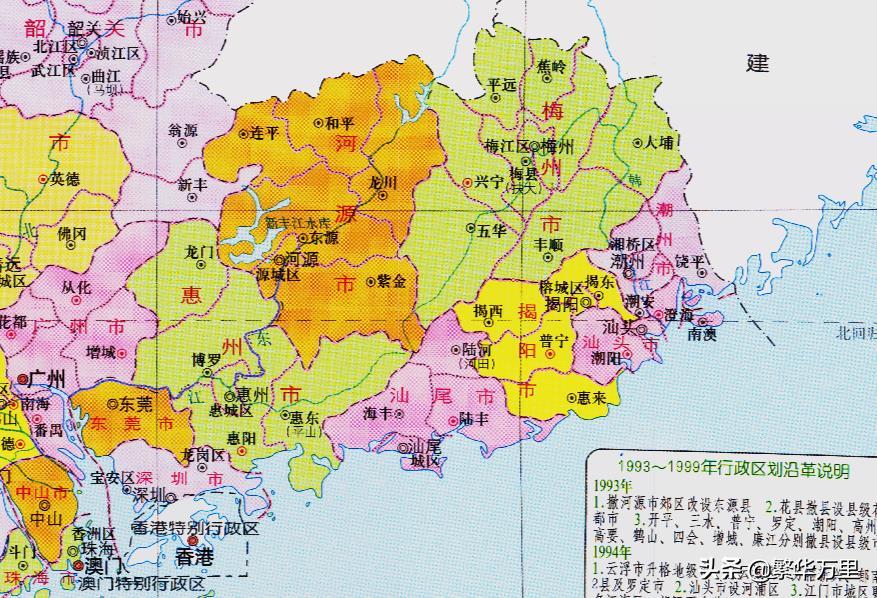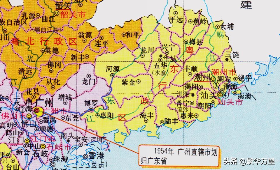 其中,潮汕专区下辖了潮安县、澄海县、饶平县、南澳县、潮阳县、揭阳县、普宁县、惠来县、南澳县等地,大体上相当于现在的潮州、揭阳、汕头3个地级市的管辖范围。1952年,潮汕专区被撤销,并入了粤东行政区管理。由于粤东行政区一口气管理了20多个县,按照五六十年代的通讯、交通条件,管理难度非常大。