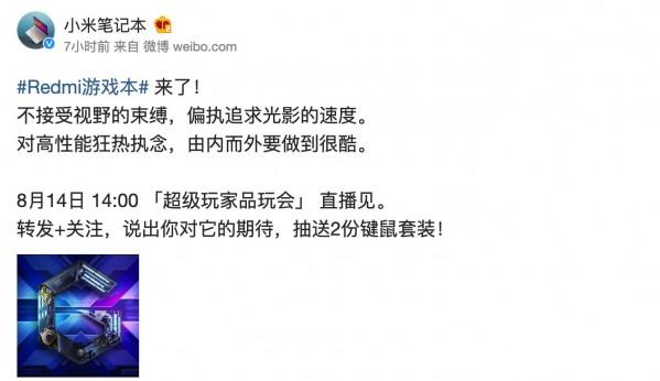 随后老对手小米也发布微博,宣布Redmi游戏本来了,发布时间定于8月14日14:00。