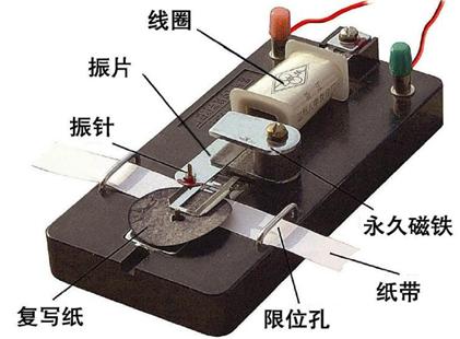 打点计时器是一种使用交流电源的计时仪器。常用的打点计时器如上图的电磁打点计时器,工作电压为4~6V。当使用的交流电频率为50Hz时,它每隔0.02s打一个点。通电后在线圈和永久磁铁的作用下,振片带动振针上下振动,于是在运动的纸带上每隔相同的时间打出一个点,通过计算纸带上的点数,计算出时间。