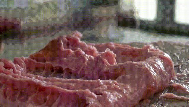 ▲不用刀剁,只用铁棍拍打成肉糊,这样的钦工肉圆才更有弹性。上图/纪录片《水润淮安》;下图/花样淮安