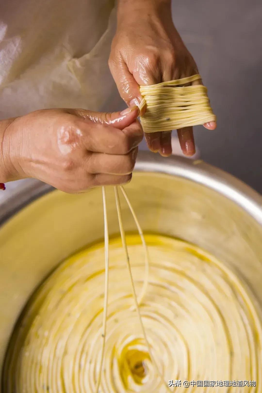 鼓楼茶馓,选用上白精面、芝麻油、细盐或绵白糖配制,拉成纤细油亮宛如丝线一样的面条,绕成各式各样的图案形状,再放到麻油中泡炸。淮安人过去走亲戚,必不可少的礼品就是一盒茶馓。