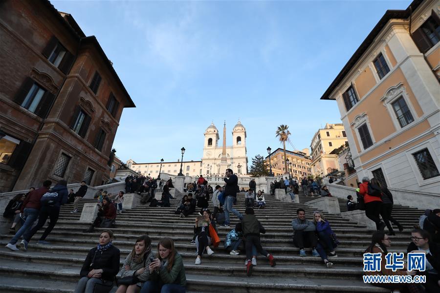 这是2019年3月6日,在意大利罗马,人们在西班牙台阶游览。这里因是电影《罗马假日》的取景地而著名。 新华社记者 程婷婷 摄