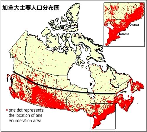 问题的根源在于两个因素,那就是地理和气候。加拿大的国土虽然比美国大,但是加拿大的有效国土却比美国少。有效国土是指一个国家适合人类生产和生活的土地,这里也包含了气候的因素。从地形上看,由于面积广大,加拿大有着丰富的地形,西部的太平洋沿岸主要是高山区,东南部的大西洋沿岸为低山和丘陵地带,北部是北极地区。此外从地形上看,加拿大广泛分布着一种地形叫做加拿大地盾,地盾有大面积基底岩石出露的地区,加拿大地盾在加拿大所覆盖的面积约为450万平方公里,地盾上往往只覆盖了一层薄土,不适合农业生产,但是适合“种树”,加拿大的地盾上针叶林有着广泛的分布,这些树木对于加拿大而言可谓无价的一个自然资源。另外加拿大的位置偏北,相当多的地方冬季漫长而寒冷,加拿大永久冻土面积为390到490万平方公里。根据一个资料的统计,加拿大的耕地面积约52万平方公里,只占其国土面积的5.2%。加拿大的耕地主要分布在两个区域,中西部大平原区和圣劳伦斯河流域低地及五大湖区。中西部大平原区,这是北美大平原(总面积约130万平方公里)的一部分,主要分布于加拿大的阿尔伯塔省、马尼托巴省和萨斯喀彻温省三省,也就是加拿大所谓的平原三省,加拿大中西部平原区的北边太冷了,主要是树,南部现在是加拿大主要的产粮区。圣劳伦斯河流域低地及五大湖区,这里土地肥沃,气候温和,是重要的农业区,也是加拿大主要的工业地带和人口分布带,加拿大主要的两个省安大略省和魁北克省的南部就是位于该地区。加拿大的主要人口分布是集中于美国交界的南部地带。