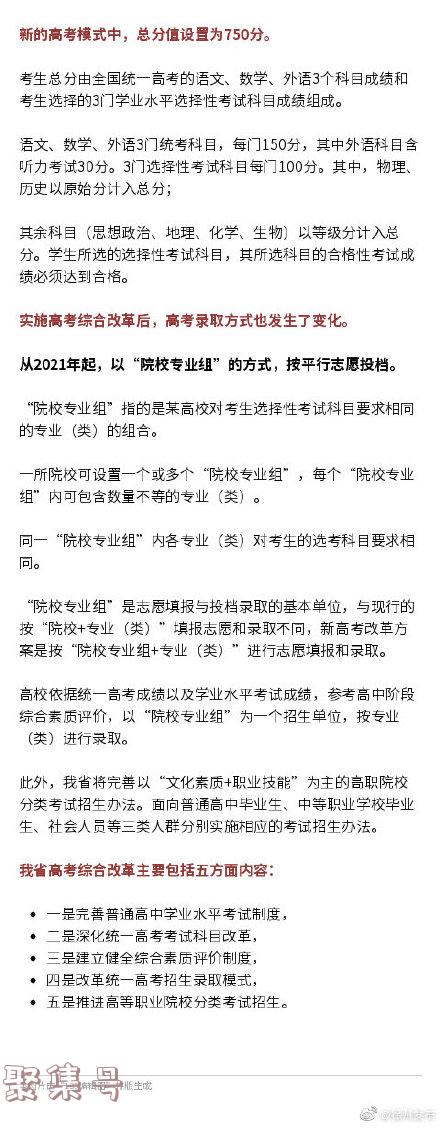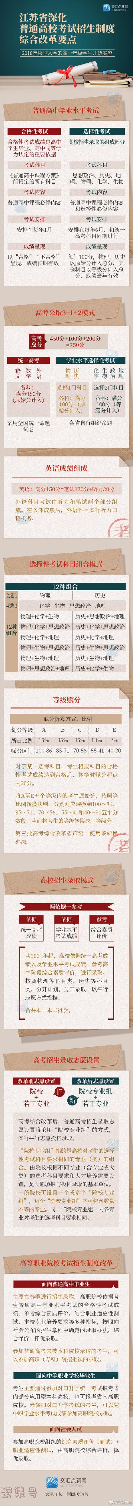 【重磅!江苏高考新方案定了!总分750分,科目“3+1+2”】记者从正在召开的江苏省普通高考综合改革新闻发布会上获悉,我省新一轮高考改革的主要模式是“3+1+2”,高考总分为750分。(L9407)“3+1+2”的“3”是指统一高考的语文、数学、外语3个科目;“1”是指考生在物理、历史两门选择性考试科目中所选择的1个科目;“2”是指考生在思想政治、地理、化学、生物4门选择性考试科目中所选择的2个科目。2021年起,语文、数学、外语3门统考科目采用全国统一命题试卷;根据教育部规定,选择性考试科目由各省自行组织命题。根据时间安排,我省自2018年启动普通高校考试招生制度综合改革,即从2018年秋季入学的高一学生开始实施。根据教育部总体安排,我省已经对相关工作进行了部署,正在有序推进。(转自交汇点)
