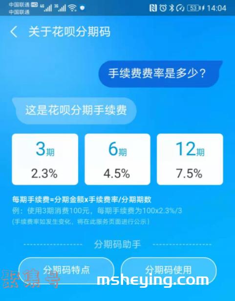 我们通过支付宝——花呗——分期码——关于分期码——如何收取手续费,可以看到花呗分期的费率。