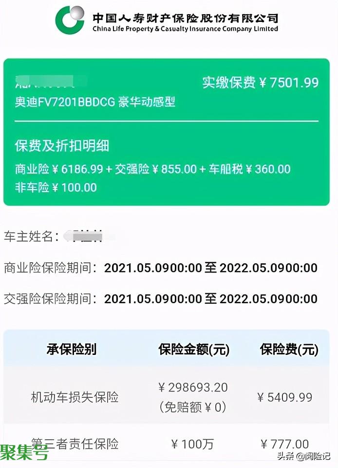 去年买的新车,今年是第二年,属于C级车,比较豪华的类型,开车一年来没有出过险,看看这种昂贵车型的车险保费:由中国人寿财险承保,总共保费7502元。