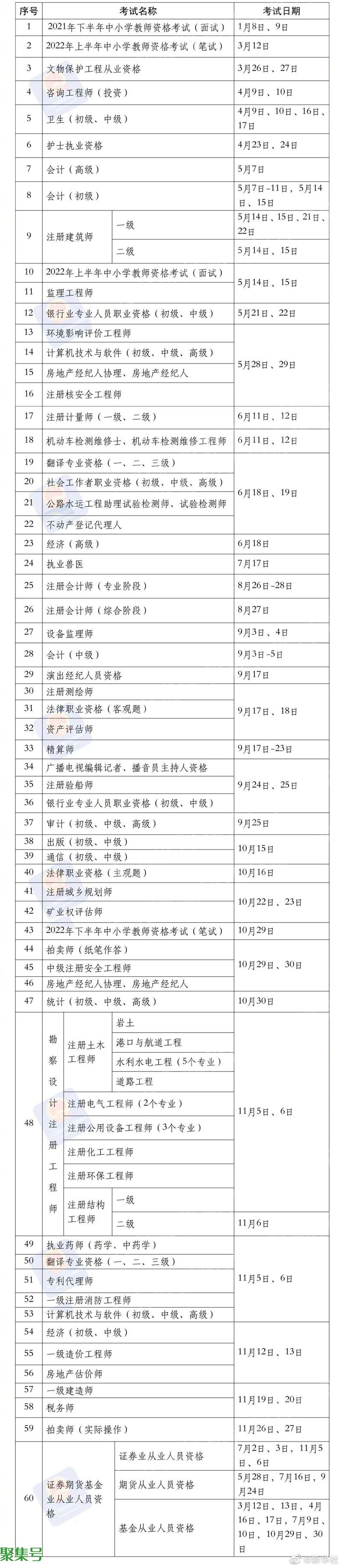 人社部14日公布2022年度专业技术人员职业资格考试工作计划,包括中小学生教师资格、会计师、精算师、建造师等各项考试日期。其中,证券期货基金业从业人员资格各次考试地点不同,具体安排以相关行业协会考试公告为准。国家职业资格考试实行统一大纲、统一命题、统一组织,注意通过正规渠道报名。(记者姜琳)