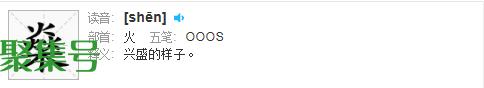 燊[shēn]:旺盛的意思。会意字,看其字体结构,火在木上燃烧,三个火,意思是烧的很热烈,火木旺盛的意思。这个字比较生僻,但是根据意思这个字用于人名应该是比较好的,有“旺盛”“兴旺”之意。