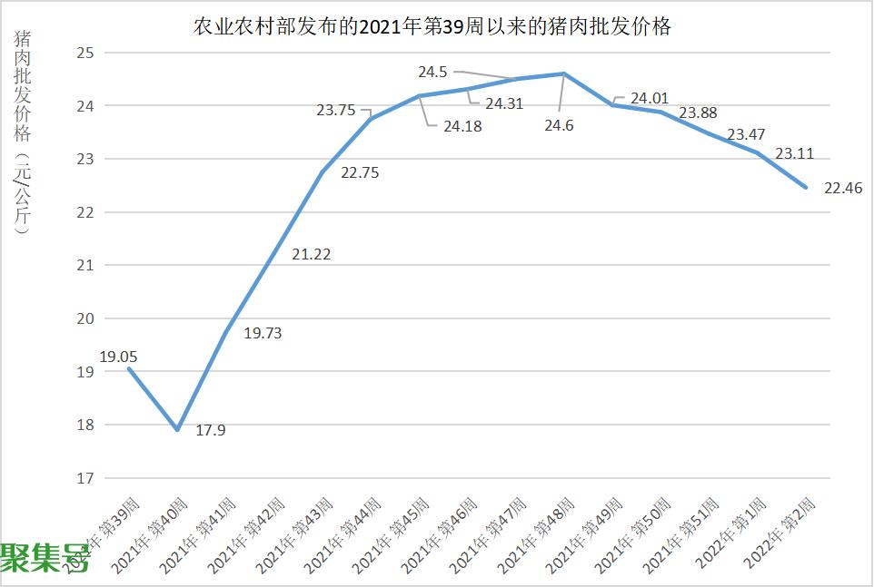 从农业农村部的数据可见,2021年第40周猪肉批发价格到达最低点,仅有17.90元/公斤。此后迎来了八周的反弹,第48周到达近期的最高点24.6元/公斤,接着连续下跌5周。
