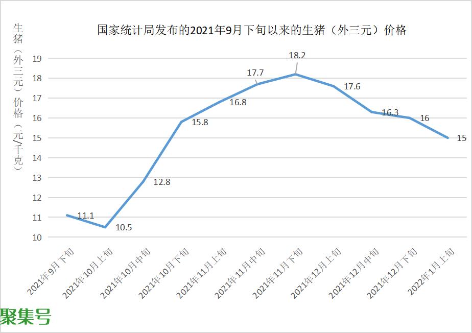 据国家统计局的披露,2022年1月上旬,生猪(外三元)每千克15元,与2021年12月下旬相比,价格环比下降6.3%。2021年12月下旬,生猪(外三元)每千克16元,环比下降1.8%,12月中旬环比下降7.4%。12月上旬,生猪(外三元)价格为每千克17.6元,环比下降3.3%。而统计局发布的11月下旬的生猪(外三元)价格比上期每千克上涨0.5元,上涨2.8%。再往前追溯,2021年10月上旬生猪价格跌至最低点10.5元/公斤后,10月中旬开始,一直到11月下旬,生猪价格都是呈环比上涨趋势,11月下旬到达近期最高,之后开始下跌。