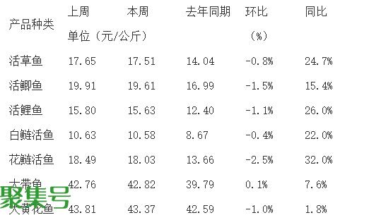 本周,重点监测的水产品草鱼、鲫鱼、鲤鱼、白鲢鱼、花鲢鱼、大带鱼和大黄花鱼与上周相比,变化幅度在-2.5~0.1%之间。