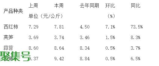 监测的19种蔬菜价格中,本周西红柿、莴笋、蒜苔和豆角的价格环比涨幅较大,幅度为7.1%、1.5%、0.5%和0.5%;菜花、白萝卜、洋白菜、韭菜和菠菜的价格环比降幅较大,幅度分别为8.9%、7.6%、4.8%、4.6%和4.0%。