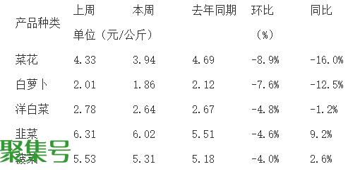 全国286家产销地批发市场19种蔬菜平均价格为4.68元/公斤,比上周下降1.4%,同比下降1.8%。
