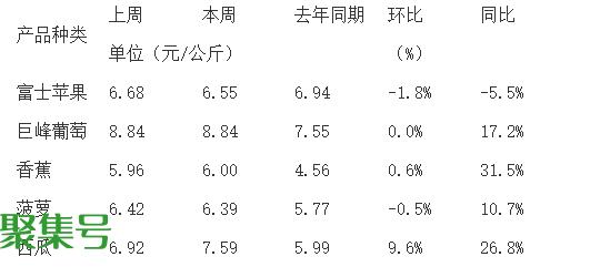 本周重点监测的5种水果平均价格为7.08元/公斤,比上周上升1.6%,同比上升14.8%。
