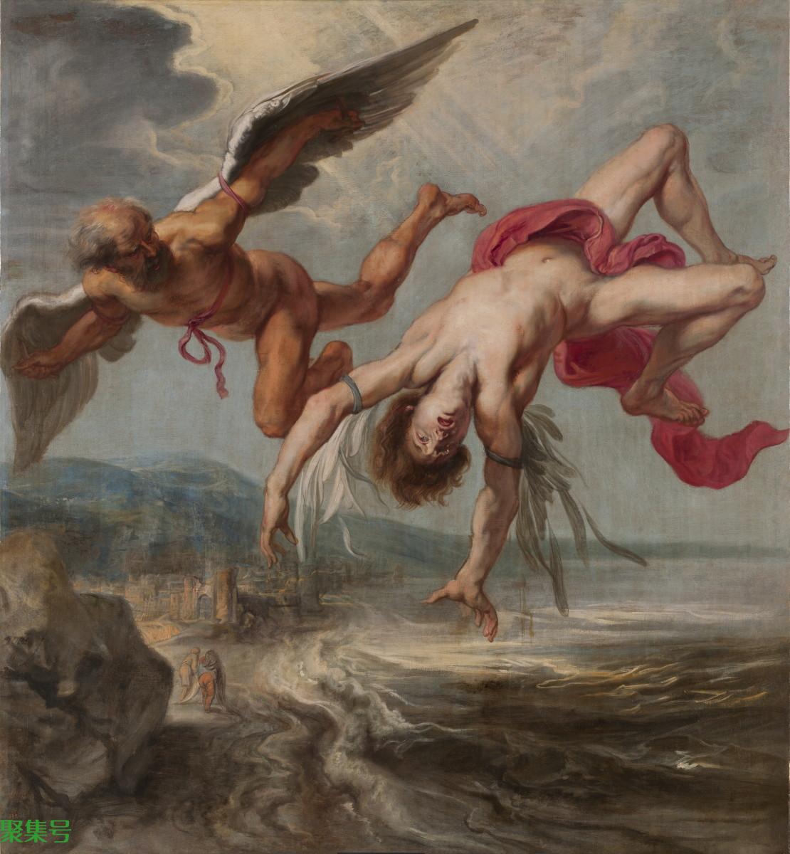 伊卡洛斯的父亲代达罗斯是为米诺斯国王建造囚禁牛头怪迷宫的工程师,国王为了不让事情泄露,将父子俩囚禁在克里特岛上的一座塔中。为此,代达罗斯制定了一个绝妙的计划来逃离这座塔。他收集羽毛并用蜡将它们粘在一起以制作翅膀,最终,他做了两套翅膀,一套给自己,一套给伊卡洛斯。代达罗斯警告他的儿子不要飞到靠近太阳的地方,以免会因高温融化而导致翅膀分崩离析。伊卡洛斯没有听他父亲的话,因为他对能飞的奇迹太着迷了。他飞得离太阳太近,双翼断裂,坠入海中。