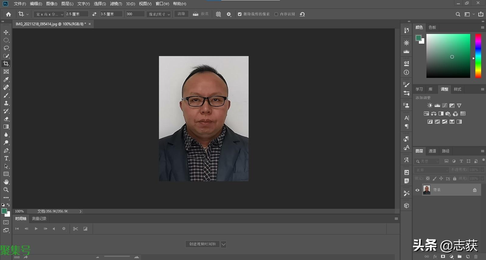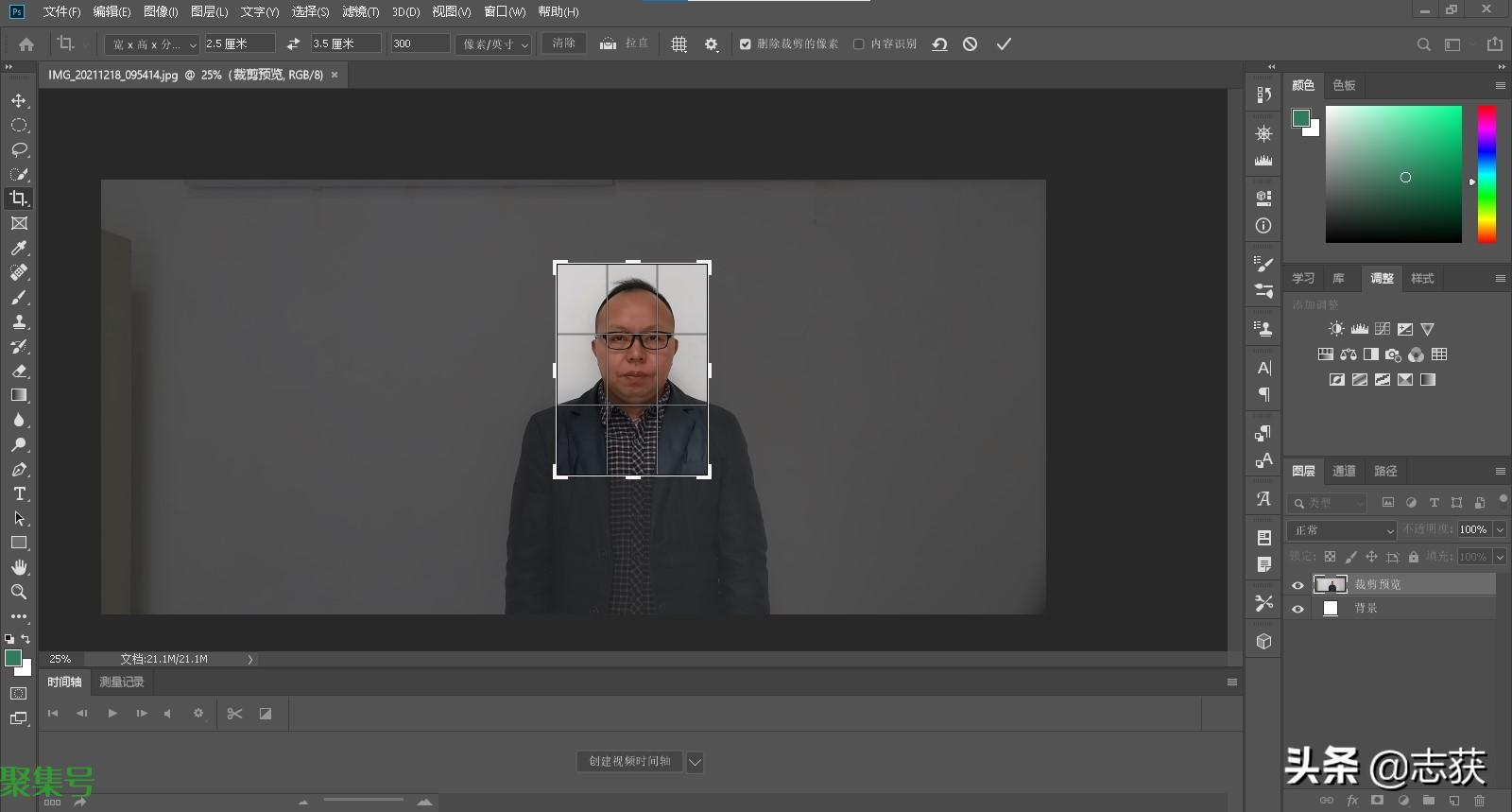 接下来我们在左侧的工具里面找到“裁剪工具”,我们以1寸照片的尺寸大小2.5cm×3.5cm为例,在上方的裁剪的参数栏设置宽2.5cm,长3.5cm,分辨率300像素,调节图片头部占图片三分之二,左右均匀,点击属性栏中“√”,确定裁剪,如下图: