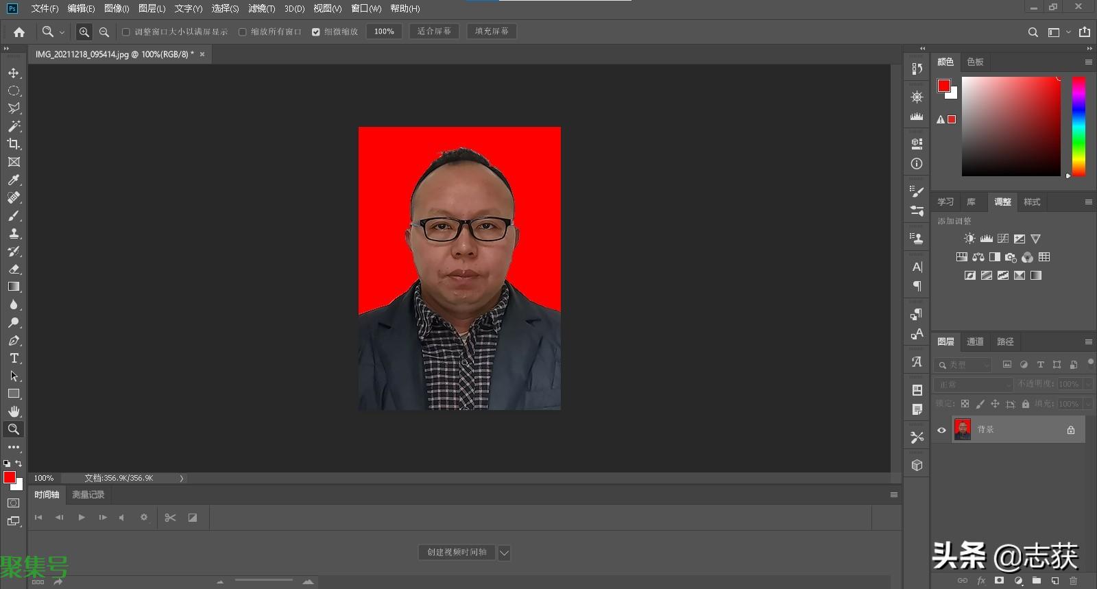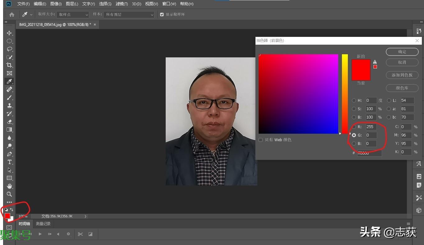 尺寸裁剪好以后,我们需要换背景,通常背景颜色有白色(R255G255B255)、蓝色(R60G140B220)、红色(R255G0B0)三种,括弧里面的RGB数值相对来说比较标准。现在以红色背景为例,我们在工具栏点击前景色,将其设置为“红色”,RGB数值R255G0B0,如下图: