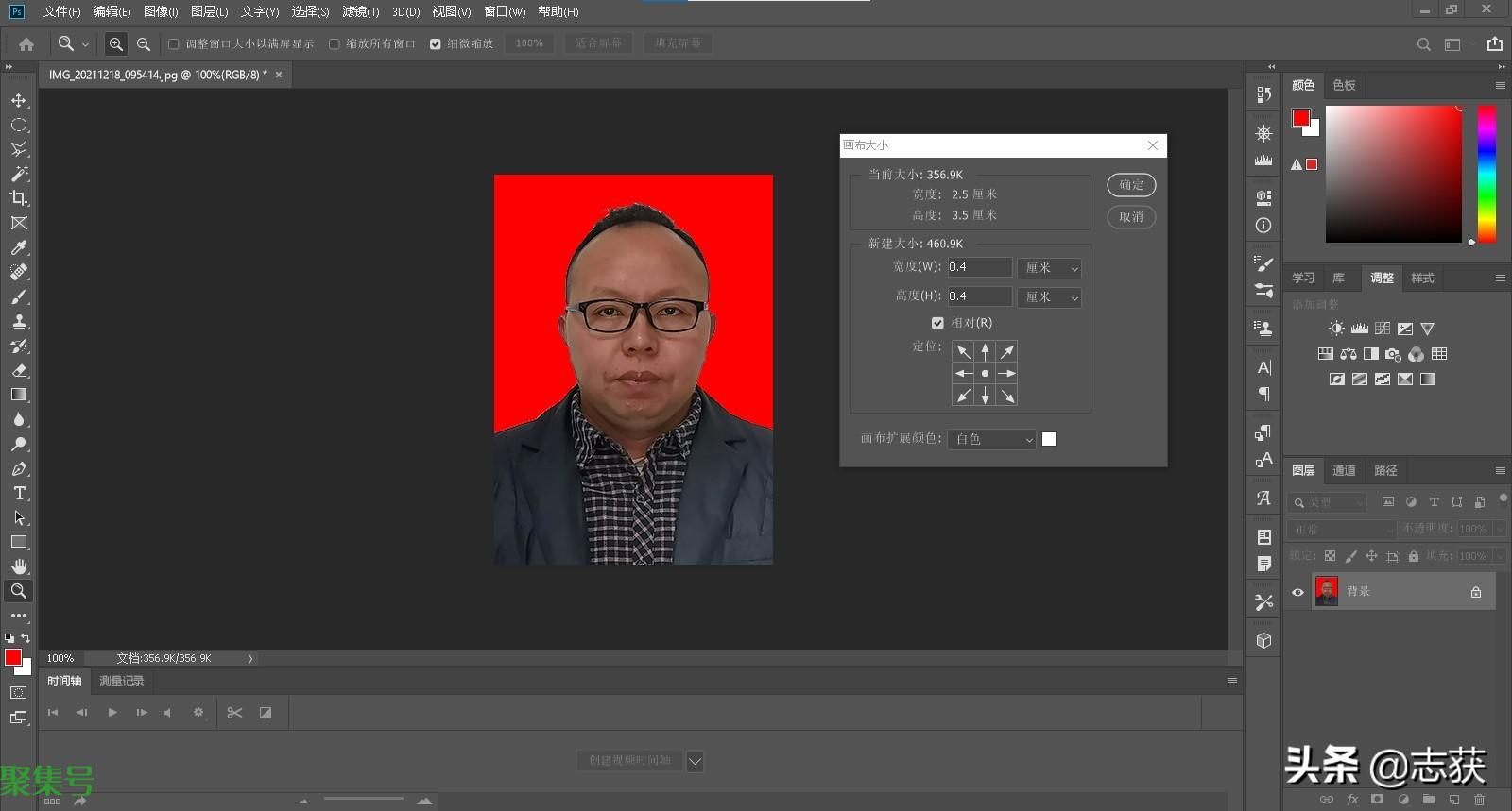 此时,我们的一张标准的证件照就制作好了,存在电脑里随时可用。如果想打印纸质的备用,我们还要进一步调整好格式,点击“图像--画布大小”每边各增加0.4cm。画布扩展颜色选择白色。 如下图: