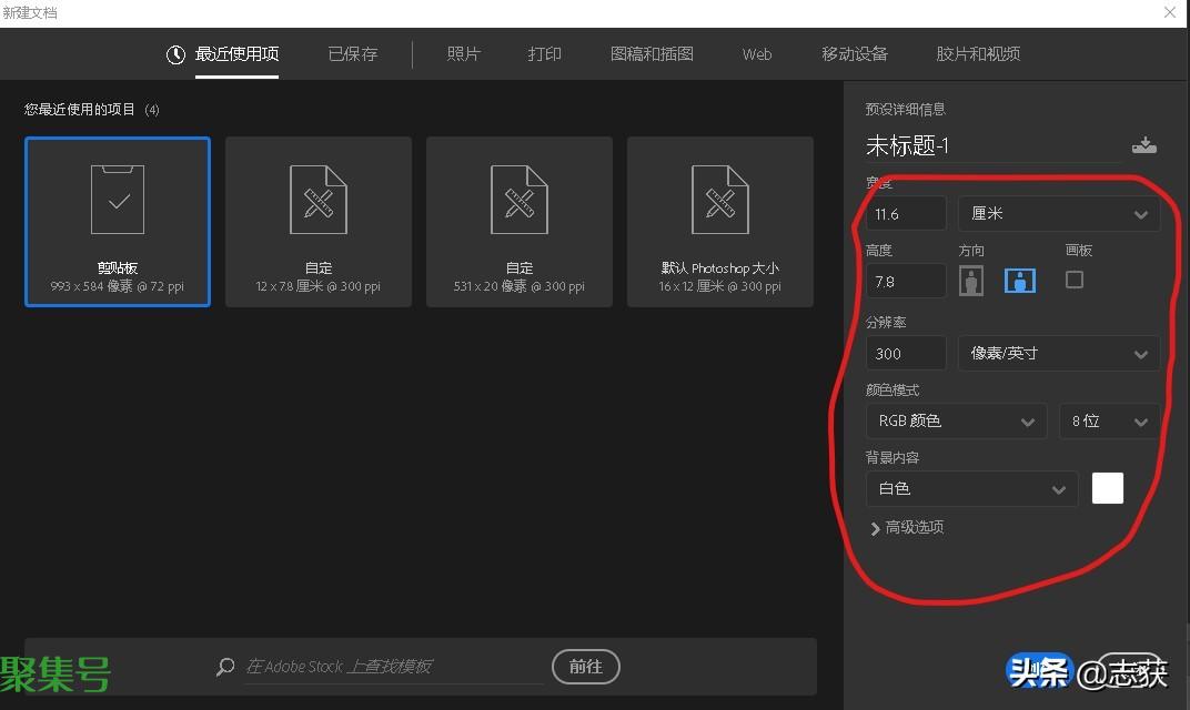 然后新建一个文件,将宽度设置为11.6cm,高度设置为7.8cm,分辨率设置为300,如下图。