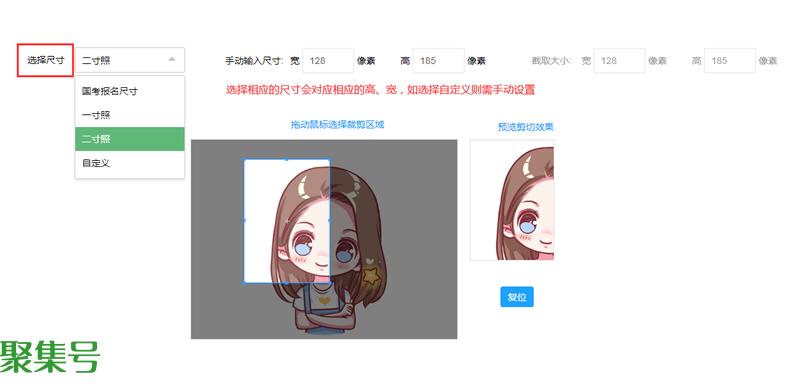 2.尺寸默认是“二寸照”,可以根据自己的需求进行相应的调整。拖动鼠标即可选择裁剪区域,右侧可查看裁剪效果,确认无误后点击保存下载即可。注意:如果点击复位按钮则会回到原始位置。