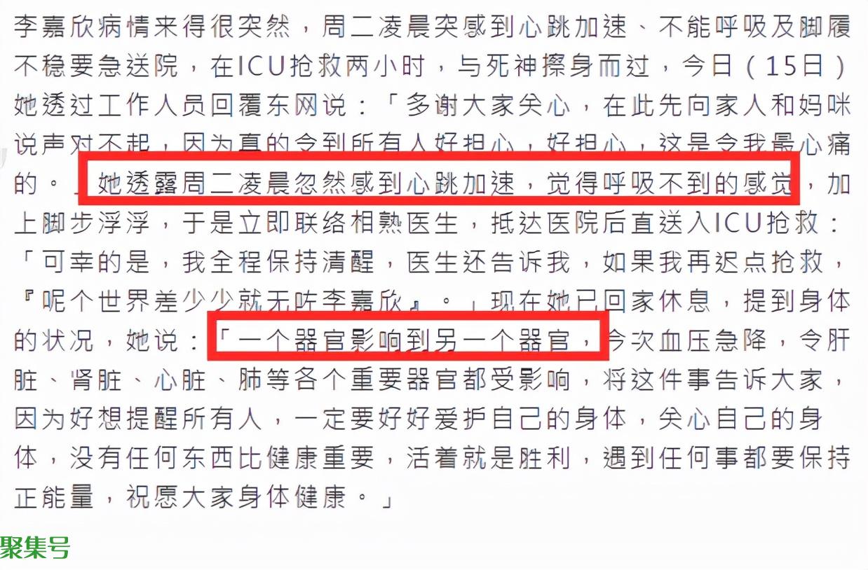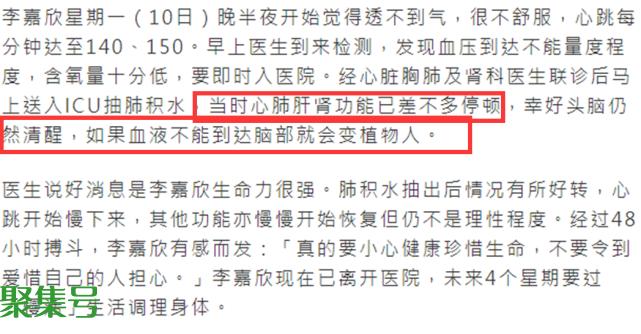 而李嘉欣所说的“48小时”,大概就是她在进行抢救后,用自己意志力和死亡搏斗的时间,还好,李嘉欣跑赢了死神。医生告知大家好消息,称李嘉欣生命力很强,肺积水抽出后情况有所好转,心跳也开始慢下来,其他功能正在恢复当中。