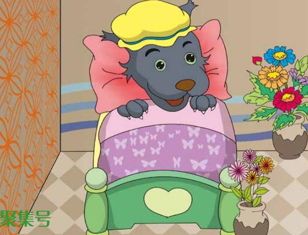 大灰狼跑到森林另一边,来到奶奶床前,把奶奶吞进肚子,然后穿上奶奶的衣服,戴上她的帽子,躺在床上。