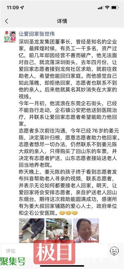 张世伟介绍,2021年4月,志愿者就曾在街头发现姜元陈,希望能提供帮助。但姜元陈感觉自己如此落魄,拒绝回家。今年1月初,当地公安发现其在街头已经无法自行走动,便送其前往医院救治,同时也联系了志愿者。后姜元陈家人在抖音上看到了志愿者发布的寻亲视频,主动联系上志愿者,现家人已接老人回家。“只是破产后他要再去深圳打拼,家里人不同意,双方之间有点矛盾。姜大叔没有离婚,其家人也没有抛弃他。”张世伟说。