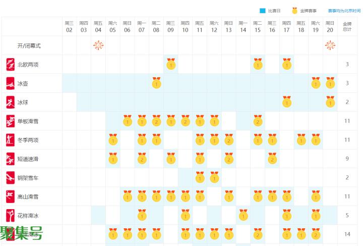 按照此前官方公布的赛程,冰壶将是最早开赛的项目,在开幕式前两天就将举行第一场混合双人循环赛。越野滑雪女子30公里集体出发决赛是最后一个结束的比赛项目,在闭幕式当天下午举行。