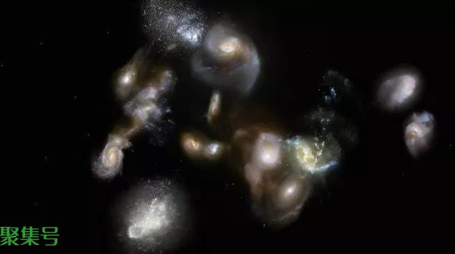 当宇宙只有14亿岁时,14个星系发生了剧烈的碰撞,形成了已知最大质量的单一结构:原星团SPT2349-56。(原星团是由多个星系组成的引力束缚系统。)尽管体积只有银河系的3倍,但这个结构最终将融合、形成质量相当于太阳10万亿倍的单一星系。更多的观测指出,在这个结构周围还有大约50个星系,它们将组成星系团。