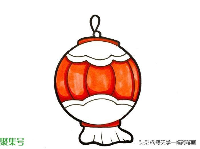 4、继续给灯笼的上半部分和下半部分涂橘红色,底部流苏涂黄色,简单的灯笼简笔画就完成啦。