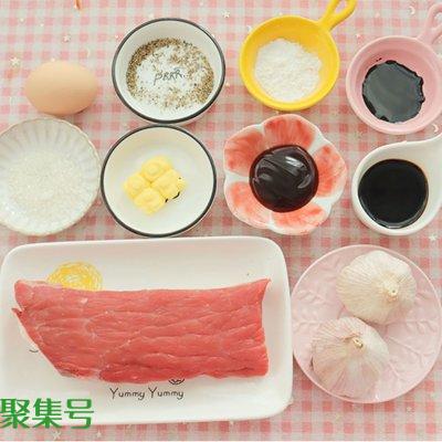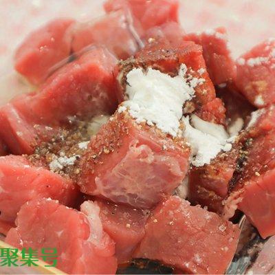 2、250g牛里脊肉切小块后加入1勺油、半勺糖、半勺黑胡椒、2勺生抽、1勺老抽、1勺淀粉、1个蛋清搅匀腌制半小时。