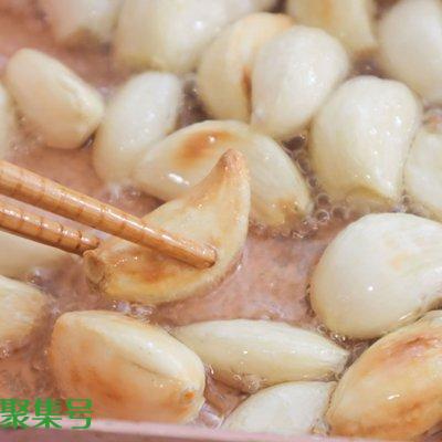 3、冷锅放入剥好的2头蒜,倒入没过一半的食用油
