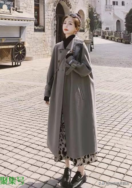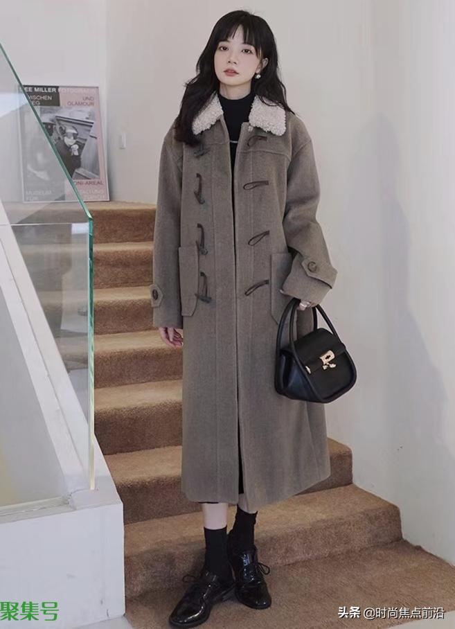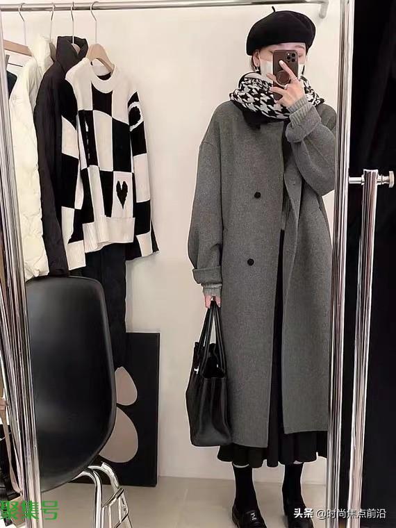 深灰色的毛呢大衣搭配黑色的打底衫和黑色的皮鞋袜子,给人一种端庄简约的感觉,黑色的包包搭配毫无违和感。