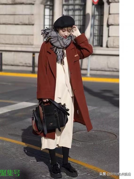 铁锈红与之最合适的颜色有黑色白色,白色能提亮整体穿搭的色彩,黑色又能使得整体沉稳,比如图中白色的打底裙,黑色的鞋袜,再加上格纹的围脖,很知性的一种穿搭。