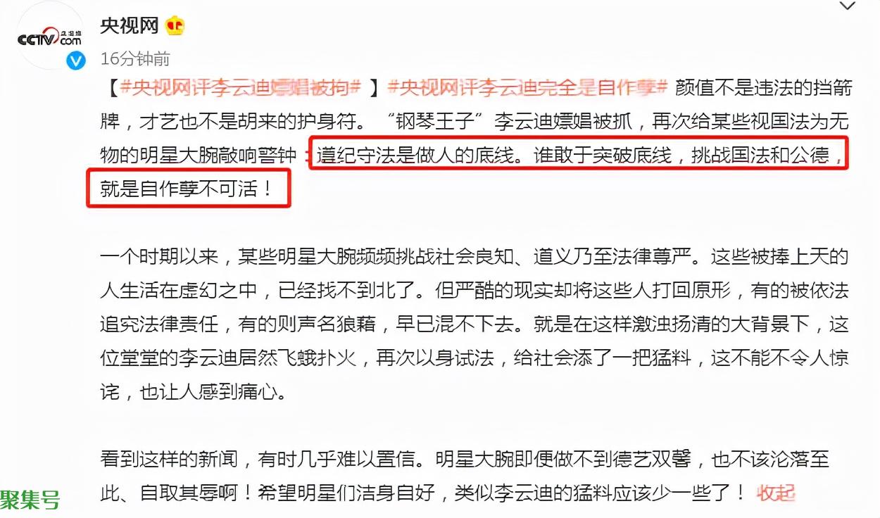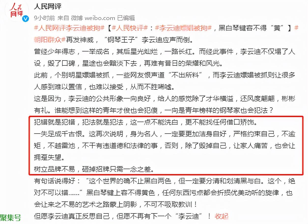 显而易见,李云迪的星途是“凉凉”了,主流媒体也对李云迪被拘事件做了评价,“人民网评”评论:黑白琴键容不得“黄”。“央视网”评论说:“遵纪守法是做人的底线。谁敢于突破底线,挑战国法和公德,就是自作孽不可活!”也给其他圈内艺人敲响了警钟。