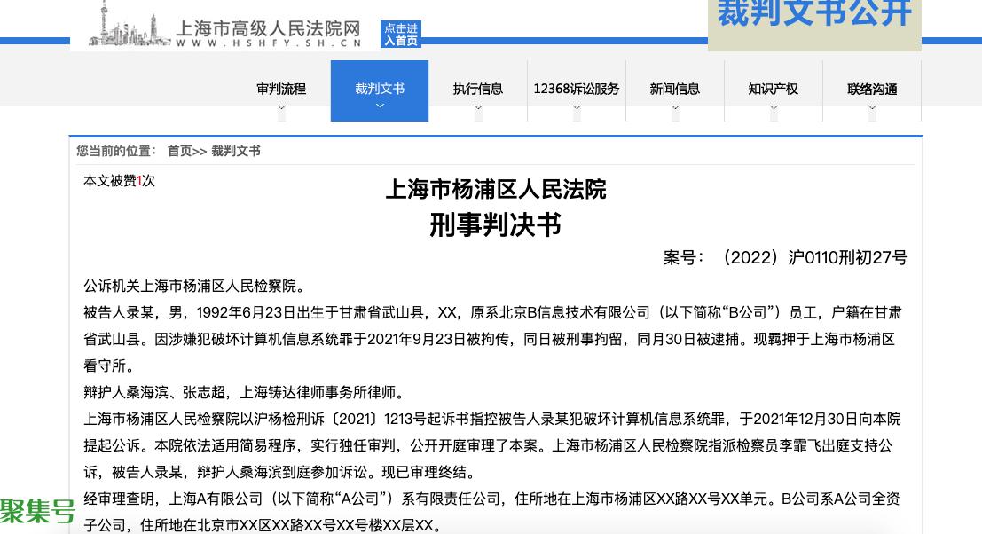 上海市杨浦区人民法院的刑事判决书显示,2021年3月,录某入职上海某公司,负责京东到家平台的代码研发工作。同年6月18日,录某从公司离职。