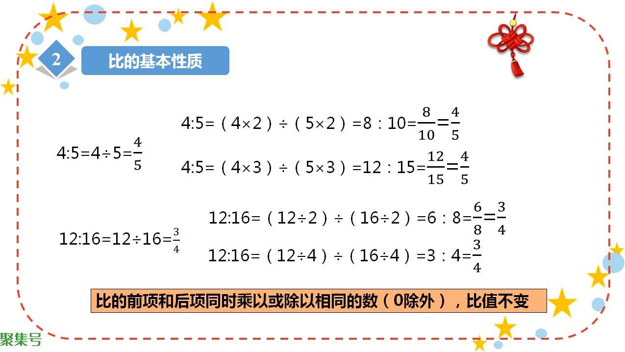 1、比的基本性质:比的前项和后项同时乘或除以相同的数(0除外),比值不变。