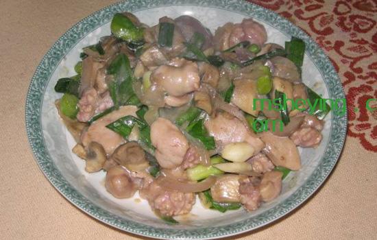 (5)加羊蛋片继续炒,大约炒3-5分钟,收干汤汁加入大蒜叶炒熟即可。
