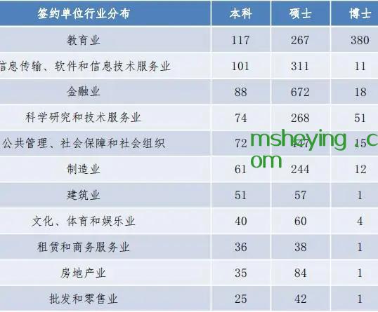 博士毕业生签约集中在教育业(71.03%),科研服务业(9.53%)。